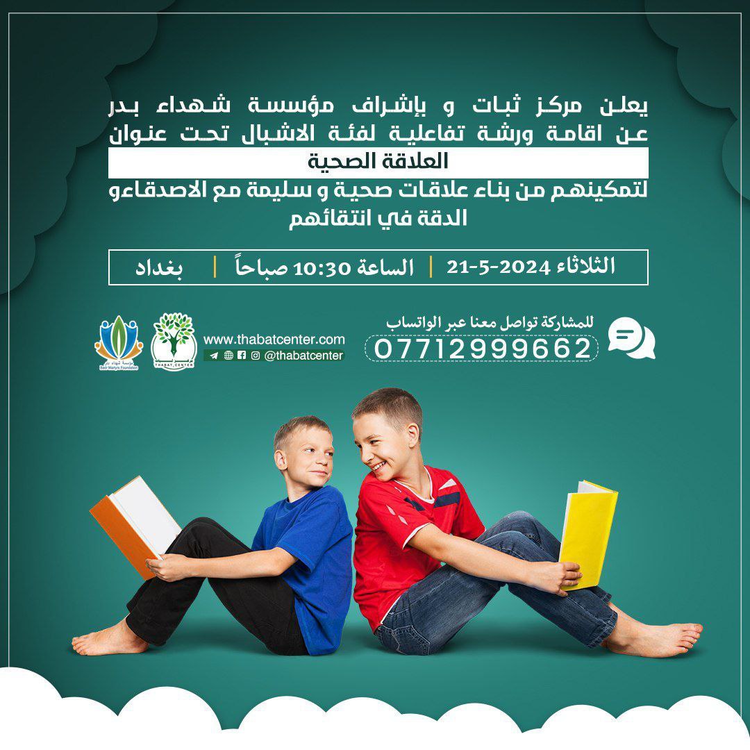 ندعوكم للحضور والمشاركة في الورشة التدريبية المجانية الموسومة “العلاقة الصحية” لفئة الاشبال.
